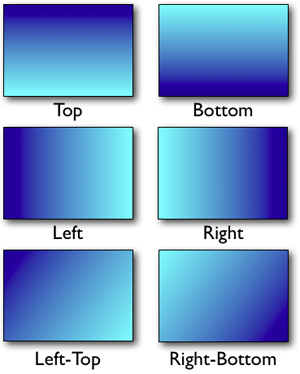 Gradient Type pop-up menu: Use this menu to select the type of gradient that you want in the background. "None" displays the background as a solid color corresponding to the selected Background Color. Selecting the other options draws a gradient in the background beginning with the background color and transitioning to the gradient color. The figure below displays example gradients corresponding to different menu selections. The gradients shown start with a dark-blue background color and transitioning to a light-blue gradient color.