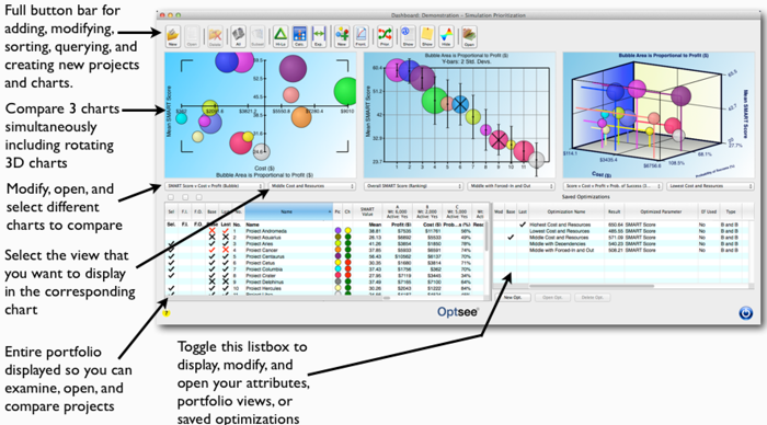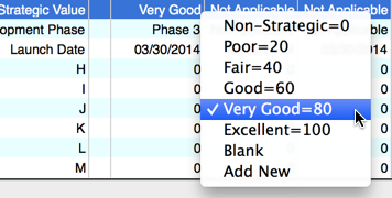 The Attribute columns: These columns display the data associated with each Project. You can name and format the column data by clicking on the 1st row to open up the attribute name form. After you save the new name, it is displayed in the 1st row of the column. In Optsee® plus, this is where you also assign the attribute weight for calculating the SMART score. There are 100 attribute columns in a Portfolio, and all of these columns can be used in bubble charts.