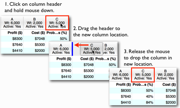 You can re-arrange the order of the attribute columns by dragging the column by the column header and dropping the column in the new location as illustrated below. You can restore the original column order by checking the [Restore Original Column Order] check box in the Portfolio Preferences form, and then saving and closing the form.