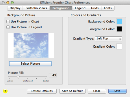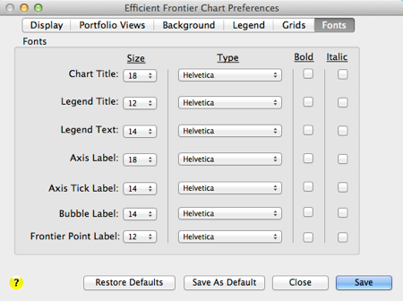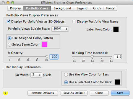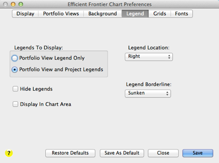 Use this form to customize the appearance and change data attributes of your Efficient Frontier charts. The form has six tabs for setting different preferences: Display, Portfolio Views, Background, Grids, Legend, and Fonts.
