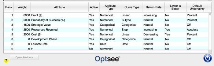 The Attribute columns: These columns display the data associated with each Project. You can name and format the column data by clicking on the 1st row to open up the attribute name form. After you save the new name, it is displayed in the 1st row of the column. In Optsee® plus, this is where you also assign the attribute weight for calculating the SMART score. There are 100 attribute columns in a Portfolio, and all of these columns can be used in bubble charts.