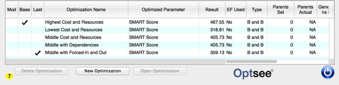 "Base" and "Last": The "Base" and "Last" columns are used to indicate the status of a project in a saved optimization. The "Base" optimization columns display the results of the optimization that has been selected by the user as a basis for comparison to other saved optimizations. The "Base" optimization is indicated by an "*" next to its name in the Optsee Optimizer Saved List Form. The "Base" and "Last" columns display the status of the project in the optimization as follows: