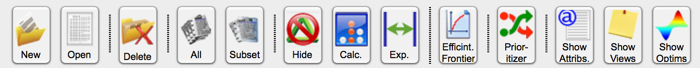 [Prioritizer]: Click on this button to open the Optsee Prioritizer. This button is disabled if there are less than three projects in the portfolio or less than three weighted attributes in the data file.