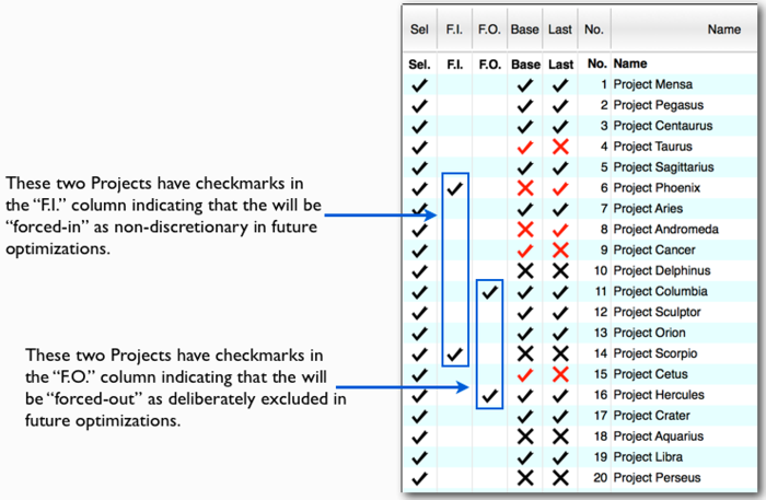 "F.O."(Force-Out): A check mark in this column indicates that the project will be excluded ("forced-out" in any optimized portfolios.
