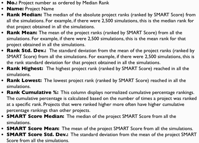 Each time a simulation test is performed, the SMART Score and Rank by Score is collected. At the end of the Prioritization Simulation a statistical analysis of the results is performed. These results are summarized in the Simulation Summary Results Form under the “Simulation Results” tab in the new portfolio form: