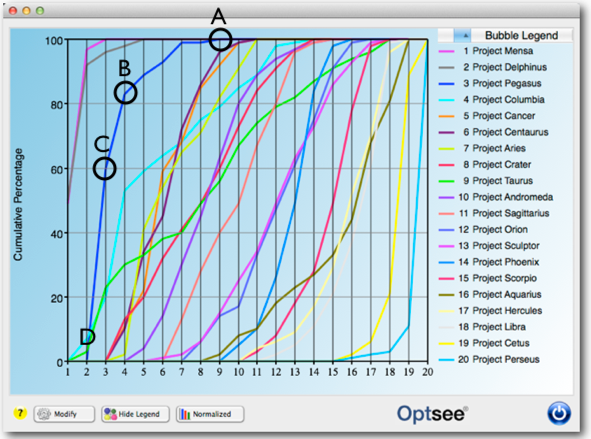 These lines can be interpreted as follows: Using Project Pegasus as an example, we can see that it was ranked 9th or higher in 100% of the simulations (Point A). It was ranked 4th or higher in approximately 85% of the simulations (Point B). It was ranked 3d or higher in 60% of the simulations (Point C)., and it was never ranked higher than 3d (Point D at 0%). Because these line charts are complex, the bar chart is the preferred way of interpreting the Cumulative Percentage results.