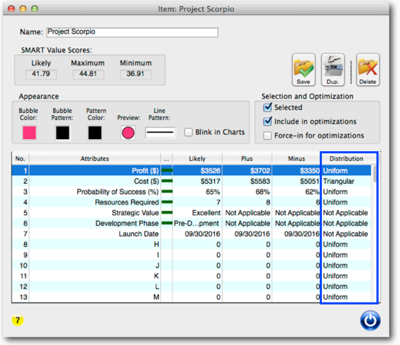 The probability distribution curves for the individual project attributes are set in the project form using the pop-up menu in the “Distribution” column.