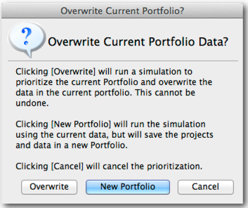 2. Choose whether to apply the prioritization simulation to the current portfolio or create a new portfolio. Creating a new portfolio duplicates the entire “parent” portfolio including charts and views before prioritizing it. Choosing [Overwrite] will overwrite the current SMART Scores in the current portfolio, and it cannot be changed back into a non-simulated portfolio.