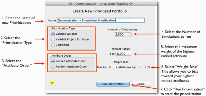 When running a Prioritization-Simulation using variable attributes, the random value assigned to an attribute is determined by the assigned probability distribution curve for that attribute for that particular project and the “Plus” and “Minus” and “Likely” values.