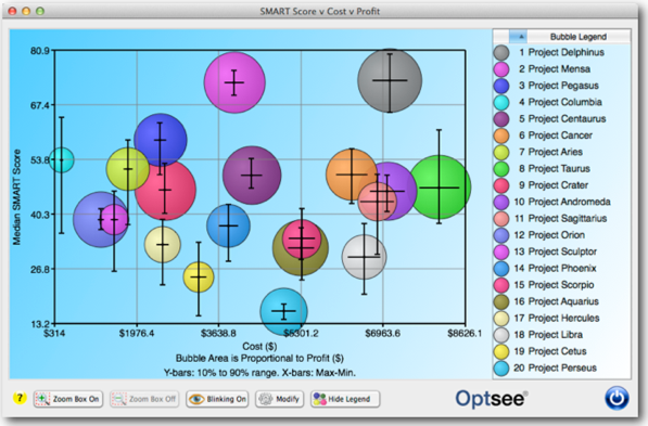 You can view and analyze all the data from the statistical summary report using Ranking Charts and Bubble Charts. For example, the ranking chart below displays the median SMART scores, the 90% and 10% limits, the maximum and minimum scores achieved in the simulation, and the “Profit” as bubble area.