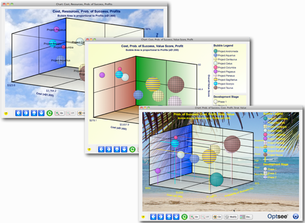 As shown in Figure 3, Optsee® lets you customize your bubble charts in many different ways, including colors, pictures, fonts, custom legends, etc. Plus, the bubbles are interactive so you can drill-down into the project data by double-clicking on a bubble or legend item.